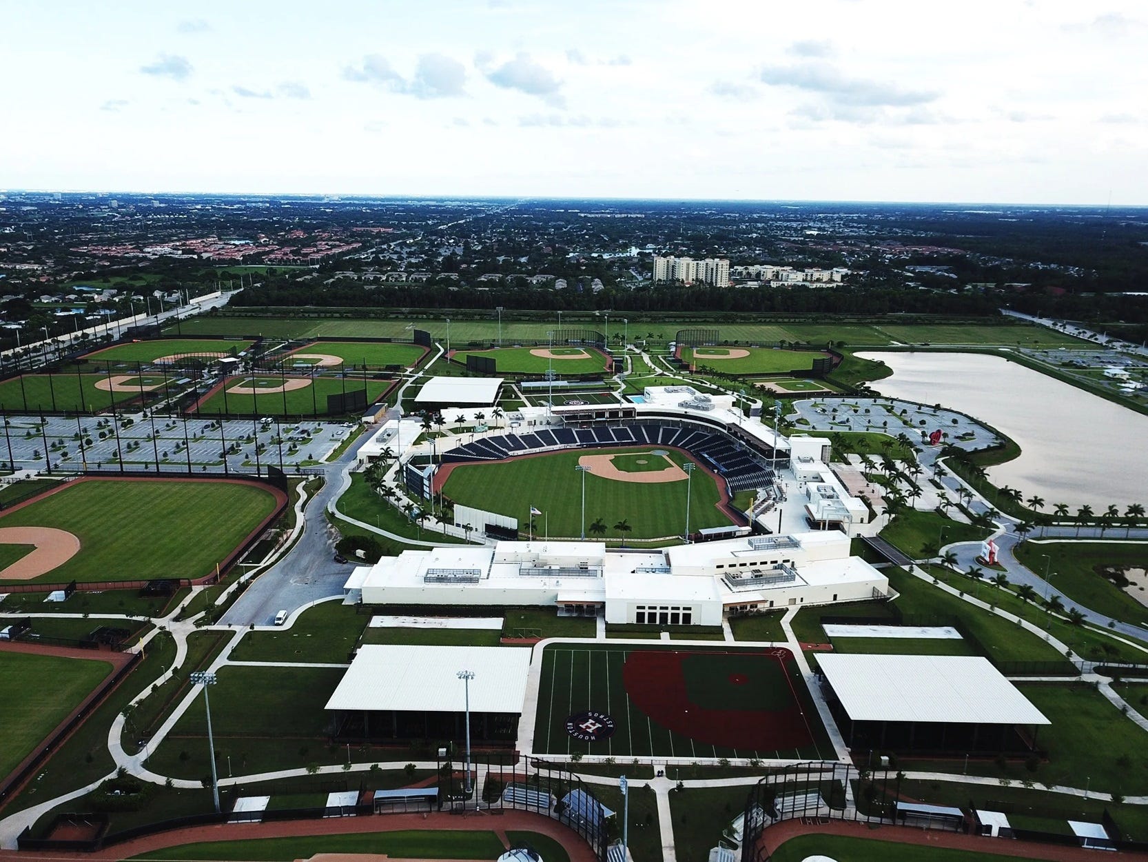 The Nats’ side of the complex includes six full-size practice fields, plus another half-field, plus a giant bullpen with 12 mounds, plus a big batting cage and an artificial turf field used for conditioning.